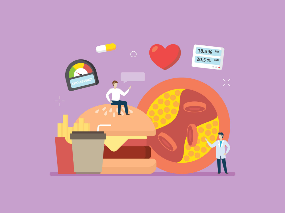 Diet plays a significant role in cholesterol management. Excessive consumption of fats and carbohydrates, particularly saturated fats and added sugars, can contribute to elevated cholesterol levels. It's important to limit the intake of saturated fats and avoid trans fats. On the other hand, incorporating foods like oats, whole grains, beans, nuts, fruits, and fatty fish into your diet can help manage cholesterol levels.