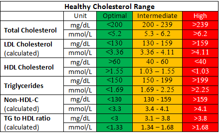 Cholesterol: For most healthy people normal cholesterol levels are: Total cholesterol LESS than 5 mmol/L. LDL cholesterol level LESS than 3 mmol/L. HDL cholesterol levels MORE than 1.2 mmol/L for women or 1.0 mmol/L for men.