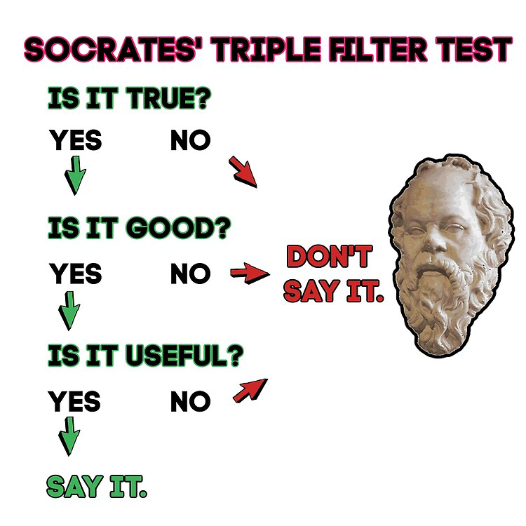 "Aha . . ." Socrates quickly replied. "Then let's move on to the second filter. Is what you are about to share Good in any way, shape, or form?"